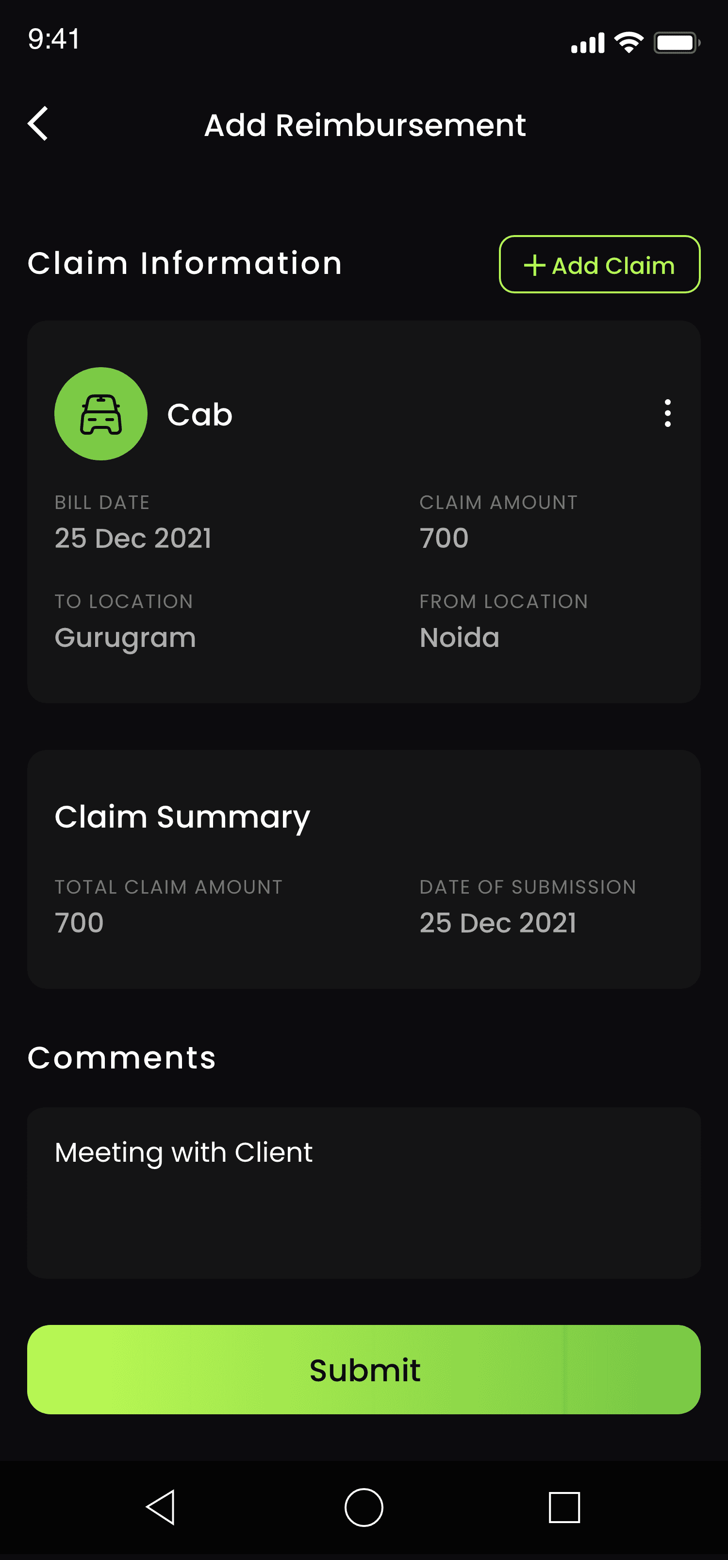 Here, users can add claim details and submit them.